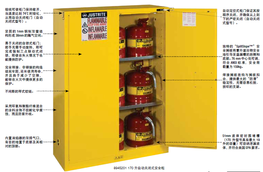 3、設計滿足美國OSHA 和NFPA 標準,Justrite 安全柜采用堅固的1mm 厚的焊接鋼板構成雙壁結構,形成38mm 的隔氣空間,有效地提高了耐火性。